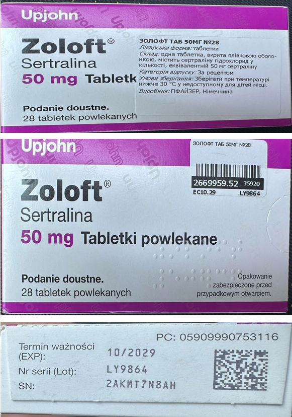 – Zoloft® (Sertralina) 50mg Tabletki powlekane, №28, серії LY9864, з маркуванням іноземною мовою, стікером на вторинній упаковці українською мовою, виробленої для ринку Польщі, що офіційно не ввозилась на територію України (фото додається).