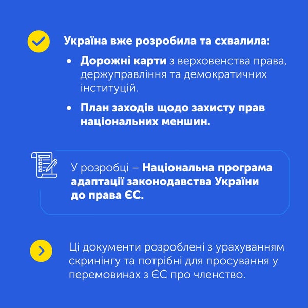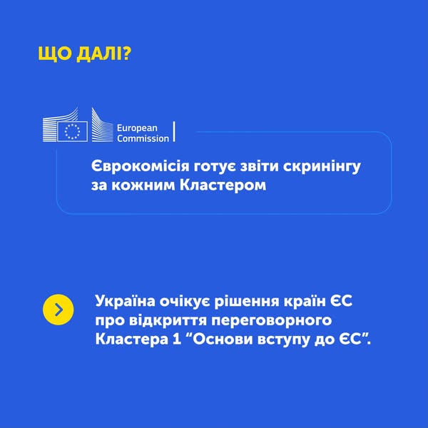 Рішення про відкриття переговорних Кластерів ухвалюють держави-члени ЄС. Україна виконала всі умови для старту переговорів по Кластеру 1 «Основи процесу вступу до ЄС», що підтвердили Єврокомісія, Європарламент і 26 країн ЄС. Наразі очікуємо на остаточне рішення всіх 27 членів.