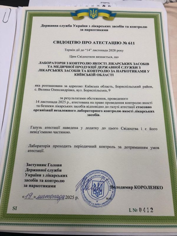 Опубліковано 21.11.2025 о 11:10На виконання Наказу Державної служби України з лікарських засобів та контролю за наркотиками від 10.11.2025 №1697-25 «Про проведення обстеження» 14.11.2025 року було проведено обстеження Лабораторії з контролю якості лікарських засобів та медичної продукції. Уповноваженим спеціалістом Державної служби України з лікарських засобів та контролю за наркотиками проведена перевірка Лабораторії на відповідність вимог «Порядку проведення галузевої атестації лабораторій з контролю якості та безпеки лікарських засобів» затвердженого Наказом Міністерства охорони здоров’я України від 14.01.2004 року №10. За результатами проведеного заходу отримано Свідоцтво про атестацію від 19 листопада 2025 року №611 яке засвідчує компетентність лабораторії.